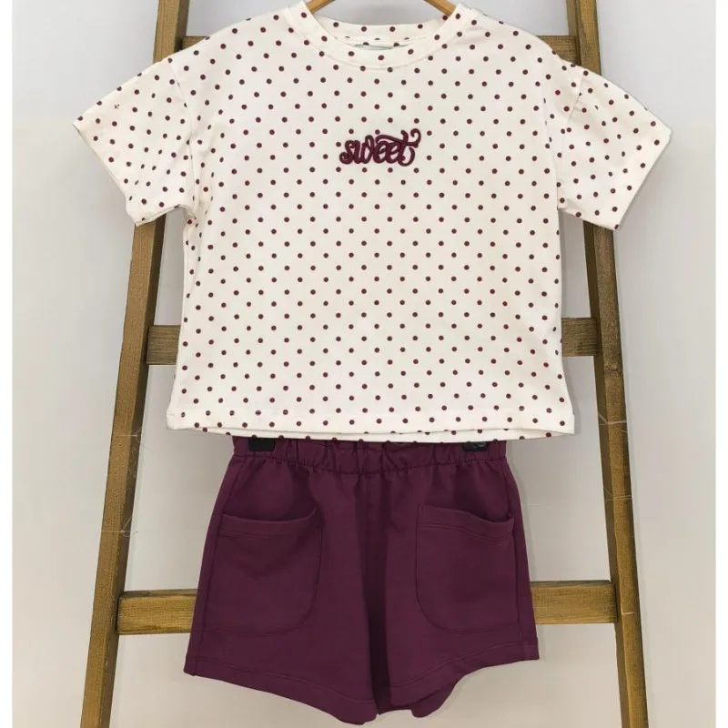 Милий літній костюм для дівчинки, що складається з білої футболки в бордовий горошок із вишитим написом "sweet" та зручних однотонних шортів насиченого бордового кольору.