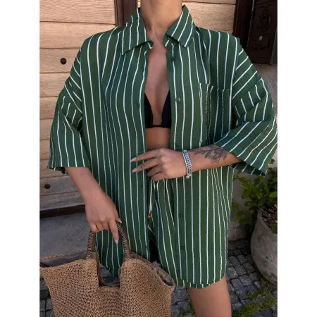 If you’re looking for the perfect summer look, check out this women’s suit in a trendy green color with white stripes. The set consists of a dropped-shoulder shirt and loose shorts with an elastic waistband. This cut emphasizes lightness and ease, helping you look modern and stylish even on the hottest summer days. The shirt features a fashionable oversized fit that feels comfortable and allows freedom of movement. Wear it untucked or tucked in—depending on your mood and style. The elastic-waist shorts adapt to your figure without pinching or discomfort, and the additional drawstring lets you adjust the fit effortlessly.