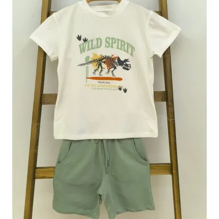 Boys’ summer set with "Wild Spirit" dinosaur T-shirt and green shorts.