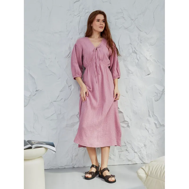 This muslin midi dress is your go-to for warm, sunny days. Made from soft, breathable fabric, it offers a relaxed fit with a feminine touch. The V-neck with ties adds charm, while the gathered elastic waist enhances your silhouette. Featuring 3/4 sleeves with elastic cuffs, it blends comfort and style perfectly. Pair it with sandals or flip-flops for an easy daytime look, vacation outfit, or casual city stroll.