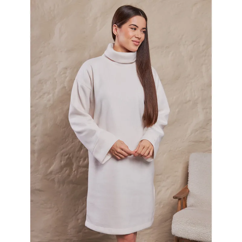 This turtleneck dress is crafted from comfortable knit that holds its shape and keeps you warm. The relaxed fit moves with you, while the soft tall neck adds extra coverage. Side slits ensure easy stride. Unlined and zip-free for effortless wear. Fit/length: relaxed, around knee length. Details: high turtleneck, dropped shoulders, long sleeves with wide cuffs, side slits. Styling: pair with tall boots, opaque tights, and a coat or jacket. Season: fall/winter/early spring. Care: gentle wash up to 30 °C, do not bleach, dry flat, low-iron inside out.