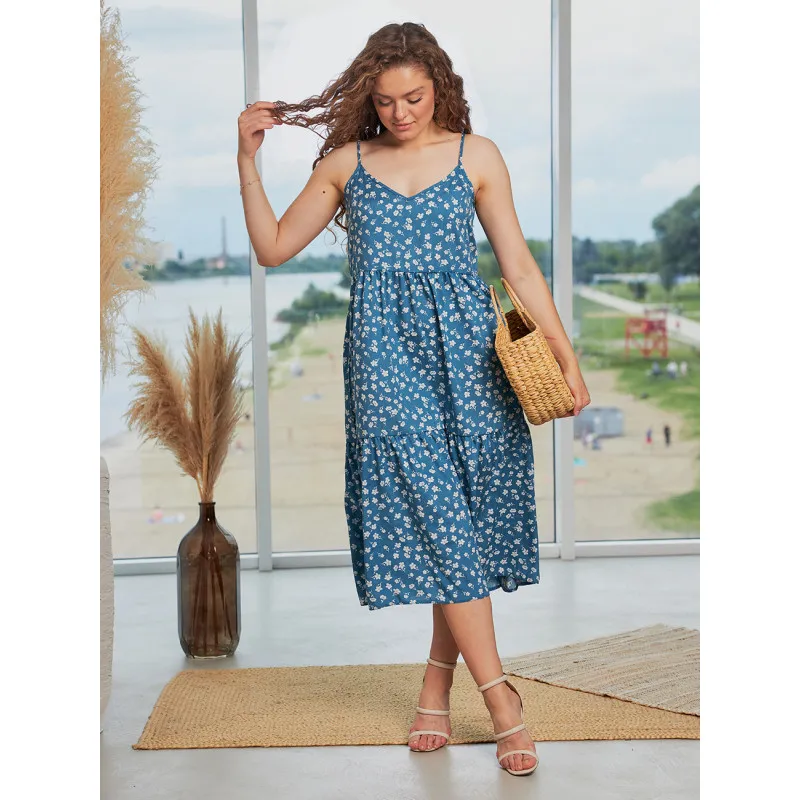 This staple sundress is the embodiment of lightness and comfort for hot summer days. The model features thin straps, a feminine V-neckline, and a flared midi skirt.