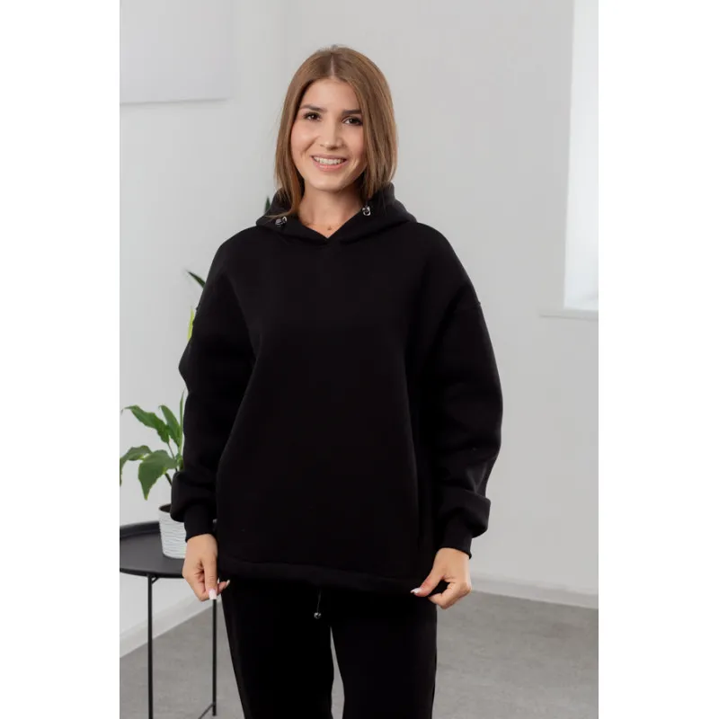 The black hoodie made of brushed footer fabric combines warmth, comfort, and minimalist style. Crafted from high-quality knitwear with a soft brushed interior, it provides cozy warmth during chilly weather. The relaxed fit allows freedom of movement, while the hood and practical kangaroo pocket add functionality. This hoodie pairs perfectly with jeans, joggers, or leggings, making it suitable for both casual and stylish looks. Ideal for walks, travel, or lounging at home — a versatile everyday piece.