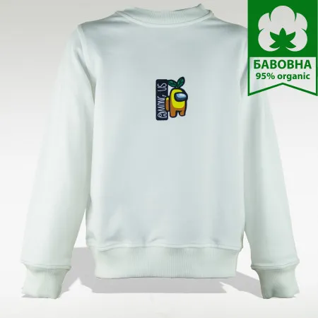 Kids white sweatshirt made of soft knit fabric, cotton blend with a touch of elastane. Raglan cut keeps movements free, elastic cuffs and a crew neck hold their shape and feel comfy under a backpack. A neat Among Us print on the chest adds character and still fits a school dress code.