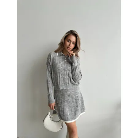 В’язаний костюм з м’якого трикотажу: светр-поло з фактурною «косою» та спідниця вище коліна з еластичним поясом. Комфортний, стильний і універсальний на кожен день.