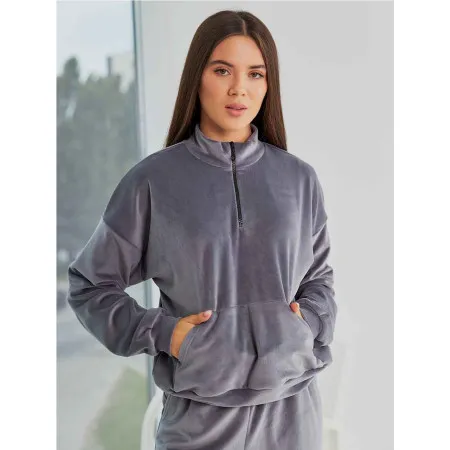 Костюм вільного крою, напівприлеглий силует, виготовлений з трикотажного полотна - велюр. Велюр являє собою міцне бавовняне полотно. Воно практично не мнеться, пропускає повітря і при цьому залишається стійким до деформації.