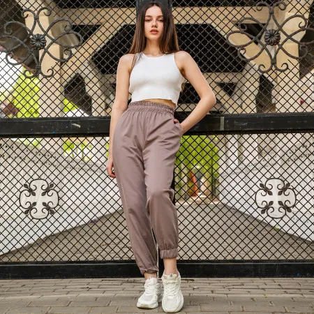 Приємні на дотик штани в стилі джогери. Особливістю моделі є гумка без шнурівки та скриті кишені.