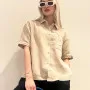 Жіноча сорочка вільного силуету. Тканини легка, дихаюча, "Жатка". У моделі короткий рукав. Низ виробу прямий. Спереду виріб повністю застібається на гудзики.