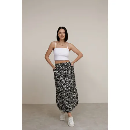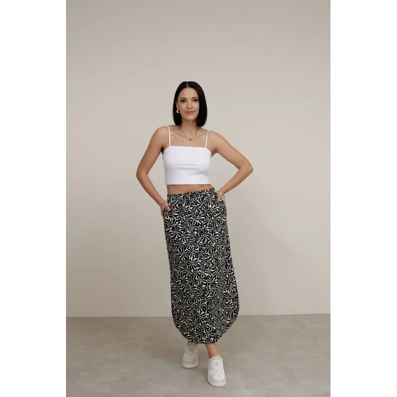 Ця модель зі 100% бавовни або бавовняної суміші поєднує легкість і практичність. Довжина додає елегантності, м'яке полотно комфортне у спеку і міжсезоння. Квітковий принт виглядає виразно, але не перевантажує образ, тому спідницю легко стилізувати під різні події.