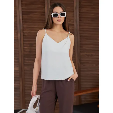 Базова штапельна майка на тонких бретелях молочного кольору.