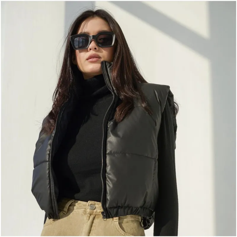 Жилетка жіноча створена для активного дня. Зовнішня тканина під екошкіру захищає від вітру і бризок, наповнювач еко пух зберігає тепло без зайвої ваги. Вкорочена довжина підтримує сучасний силует і пасує до штанів з високою талією та до спідниць. Чорна жилетка легко вписується у капсульний гардероб.